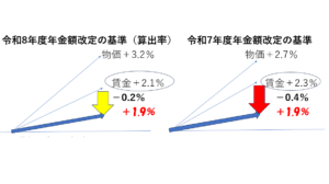 プラスで、両者ともにプラス改定であることから、令和8年度年金額改定の